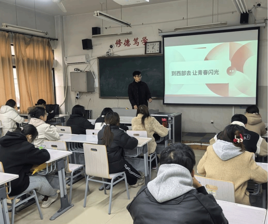 会上,丁经伟重点解读了外语学科毕业生参与西部计划的报名节点、专业适配岗位、语言服务优势及保障政策等,同时向同学们介绍了往届学姐学长扎根西部,奉献基层的事迹,希望外语学子以语言为桥,将翻译技能转化为基层治理效能,让青春在西部热土上绽放异彩。